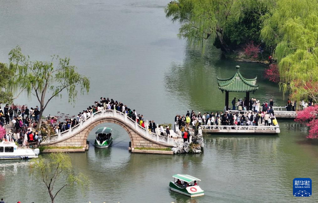 4月4日,游客在江苏扬州瘦西湖风景区游览(无人机照片)。