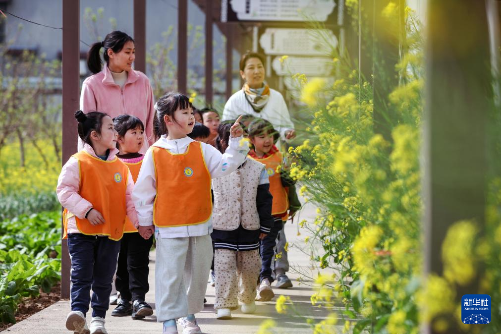 3月31日,农历三月初三,在河南省焦作市博爱县九街社区,幼儿园的教师带领小朋友踏青赏花。