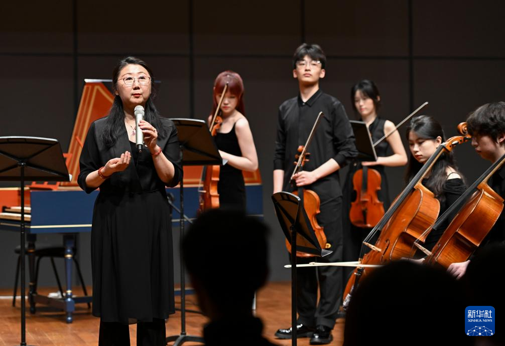 5月4日,演奏家沈凡秀(左一)在演出间隙为观众介绍巴洛克室内乐。