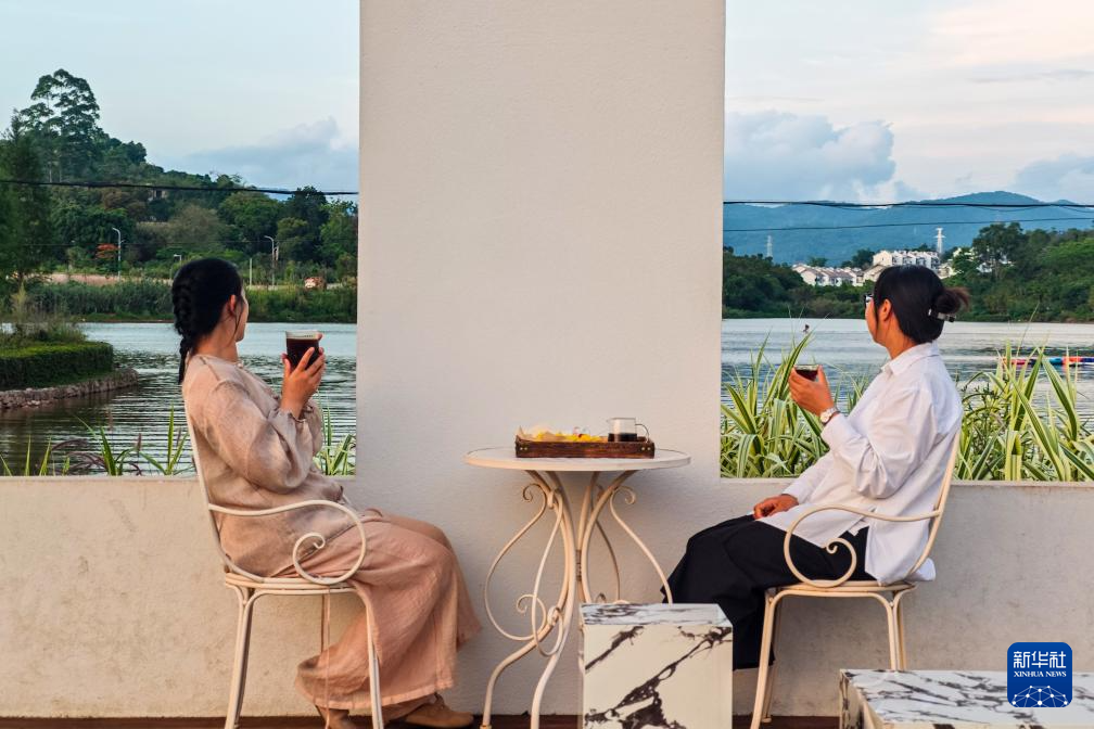 顾客在云南普洱市思茅区普洱茶小镇的一家咖啡馆休闲(2025年5月15日摄)。