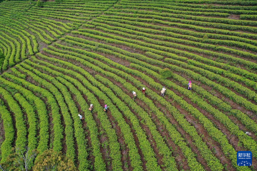 茶农在云南省普洱市宁洱哈尼族彝族自治县梅子镇建设村乐东山茶园采摘春茶(无人机照片,2025年4月15日摄)。
