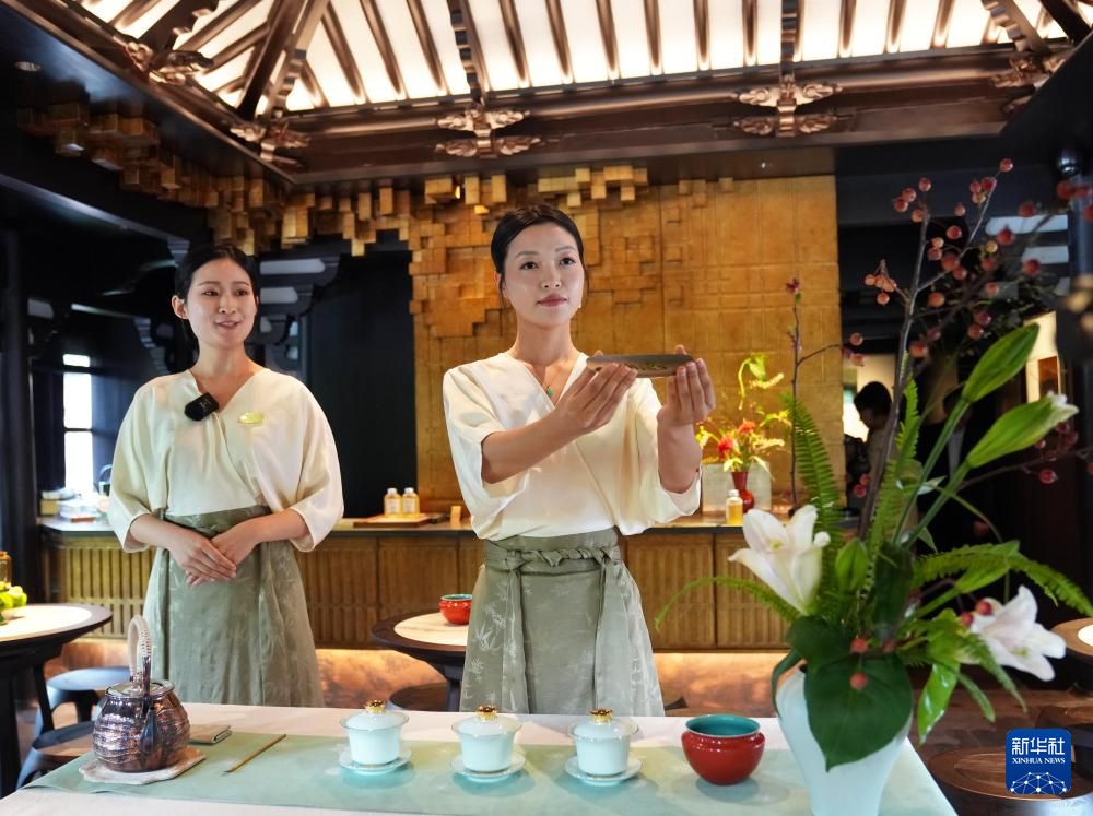 7月10日,湖心亭的茶艺师在进行非遗茶艺展示。