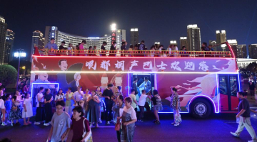 8月18日,游客在三福古典家具有限公司文创产品展示台试戴木制手串。