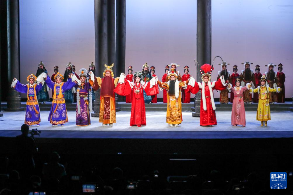 9月5日晚,在兰州音乐厅,演员在京剧《凉州辞》演出结束后返场谢幕。