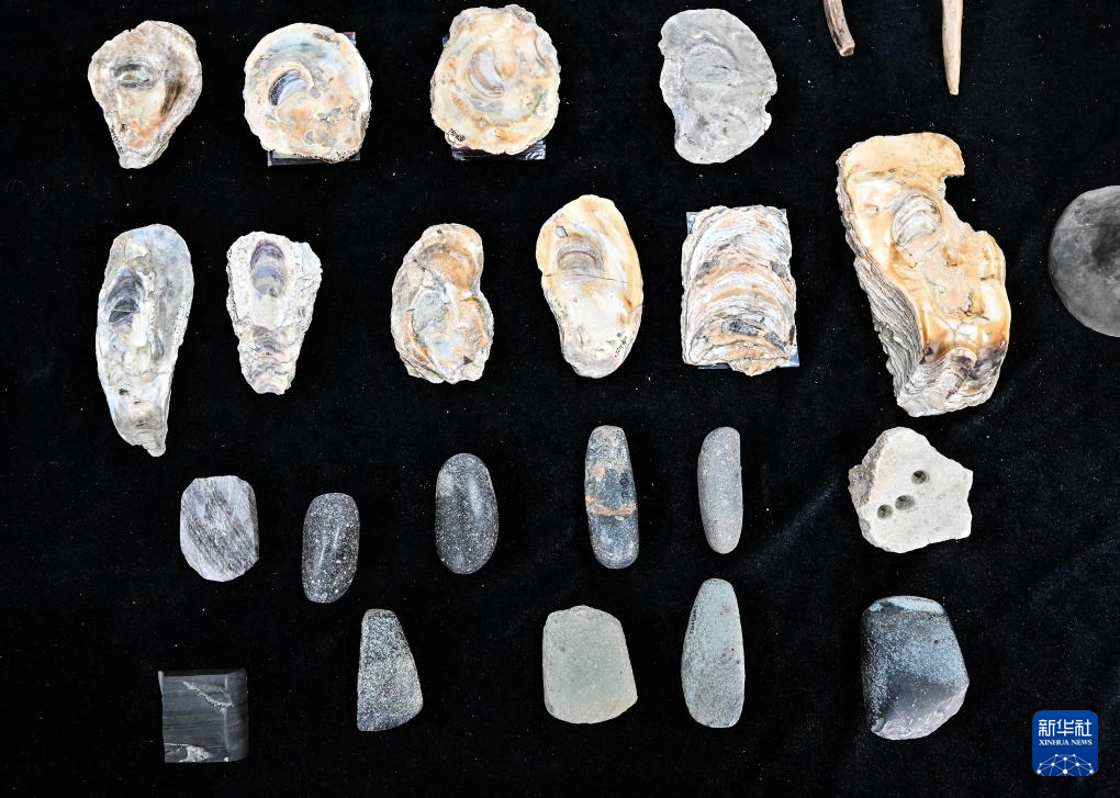 井头山遗址出土的贝器和石器(12月15日摄)。