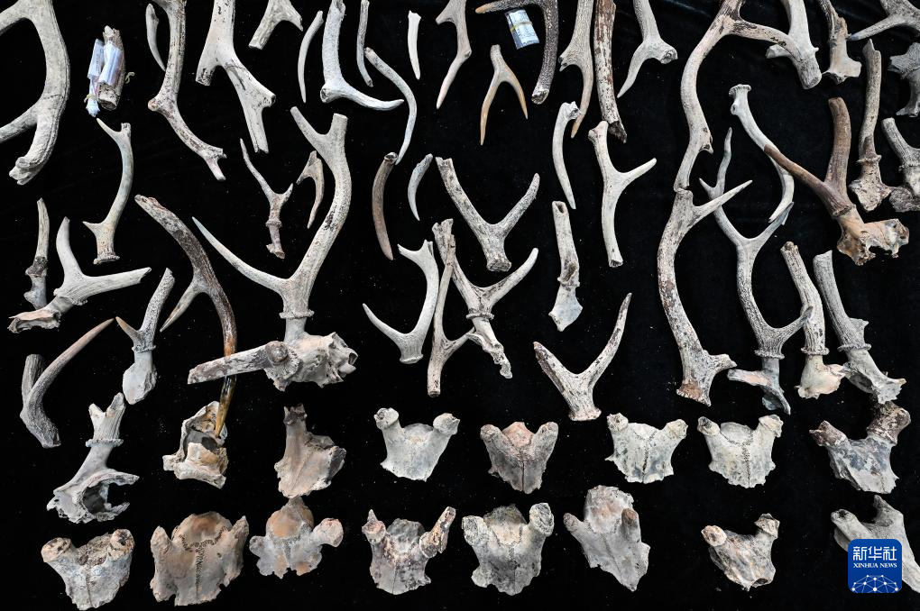 井头山遗址出土的鹿角和头骨(12月15日摄)。