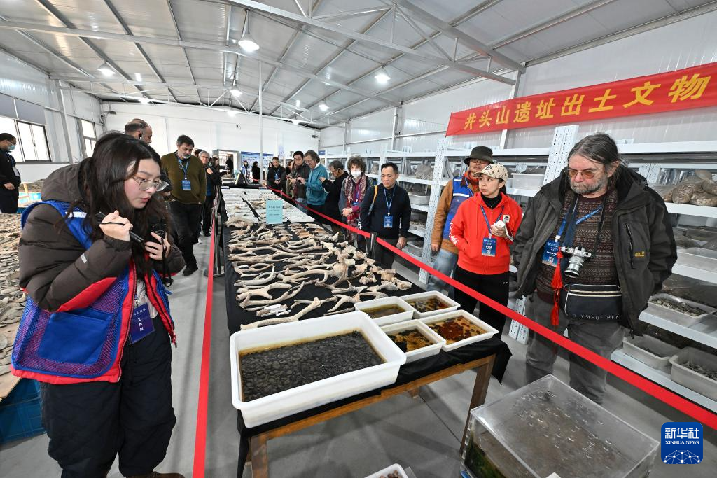 参加世界考古论坛的专家学者在井头山遗址文物库房内参观出土文物(12月15日摄)。