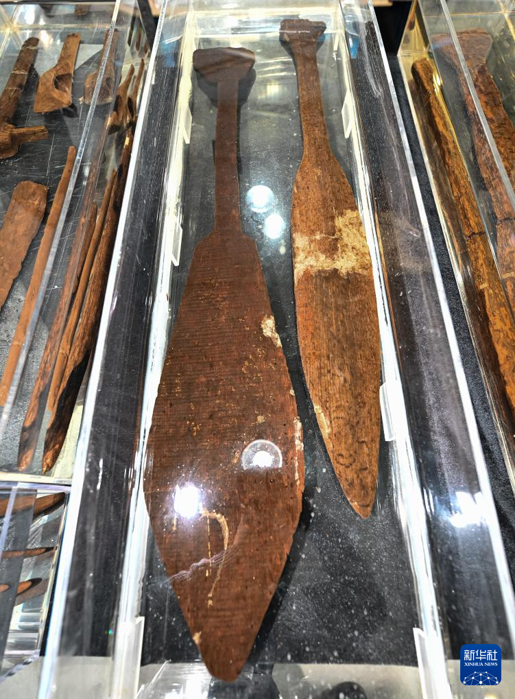 这是井头山遗址(右)和其附近的田螺山遗址(左)出土的木桨(12月15日摄)。