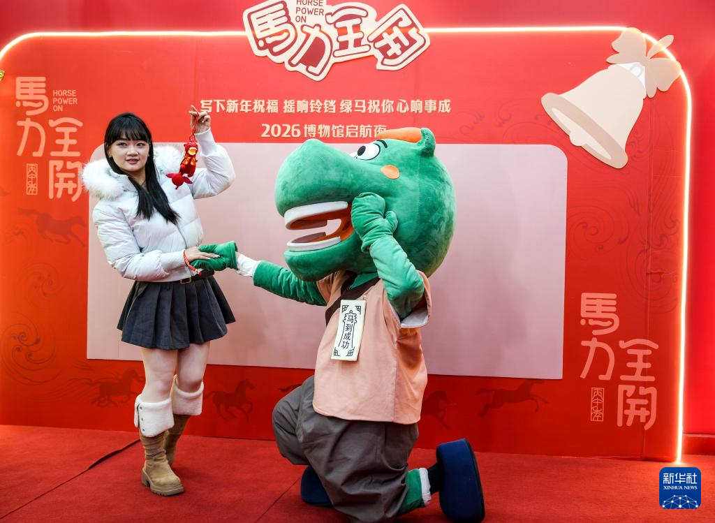 1月26日晚,在甘肃省博物馆一楼大厅,马踏飞燕IP人偶在“马力全开——博物馆启航夜”活动现场与观众互动。