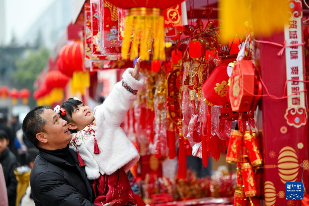 2月3日,家长带着小朋友在贵州省贵阳市筑城广场选购新春饰品。