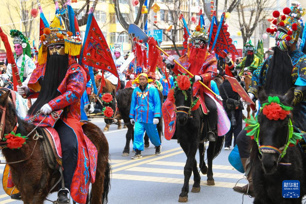 3月3日,农历正月十五,陕西省宝鸡市陇县“社火闹春·狂欢陇州”元宵社火游演火热上演。来自全县10个镇的49支社火队伍沿城区主干道前行,马社火、步社火、高芯社火等20余种社火轮番登场。