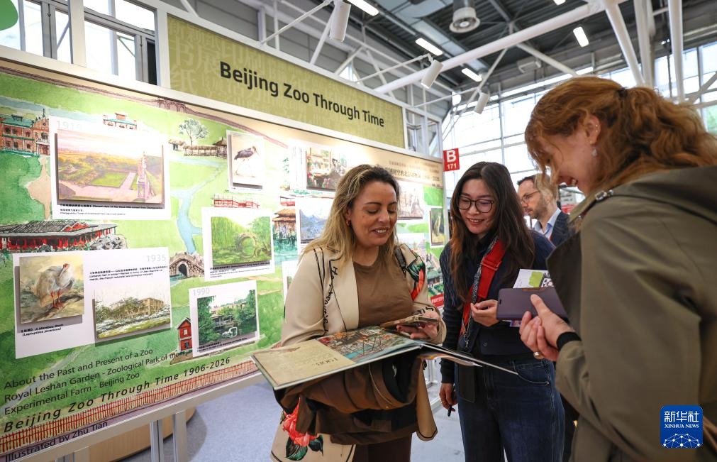 4月14日,在意大利博洛尼亚,参展商在第63届博洛尼亚国际儿童书展“穿越时空的北京动物园”微展览前介绍插画作品。