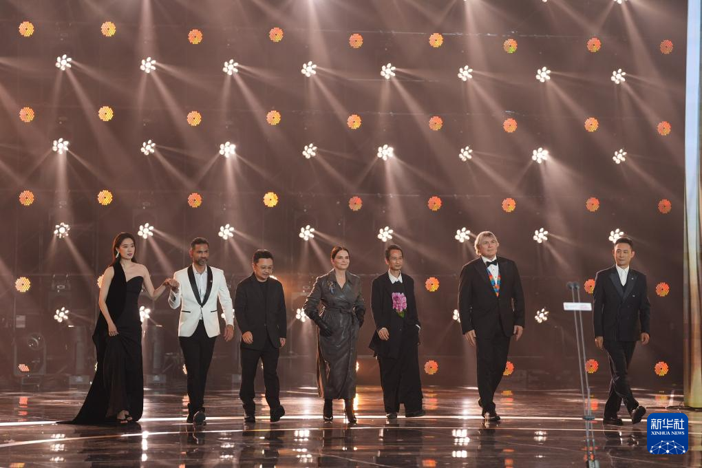 4月16日,第十六届北京国际电影节“天坛奖”国际评委会主席朱丽叶·比诺什(左四)和评委毕赣(左三)、陈英雄(右三)、加布里埃尔·马斯卡罗(左二)、西蒙·弗兰格林(右二)、张小斐(左一)、张译 (右一)在开幕式上。