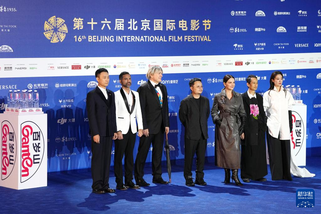 4月16日,第十六届北京国际电影节“天坛奖”国际评委会主席朱丽叶·比诺什(右三)和评委毕赣(中)、陈英雄(右二)、加布里埃尔·马斯卡罗(左二)、西蒙·弗兰格林(左三)、张小斐(右一)、张译 (左一)亮相开幕式红毯。