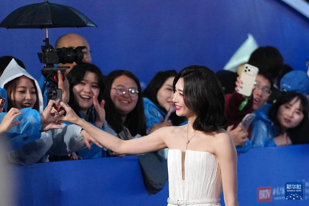4月16日,演员江疏影在开幕红毯上与影迷互动。