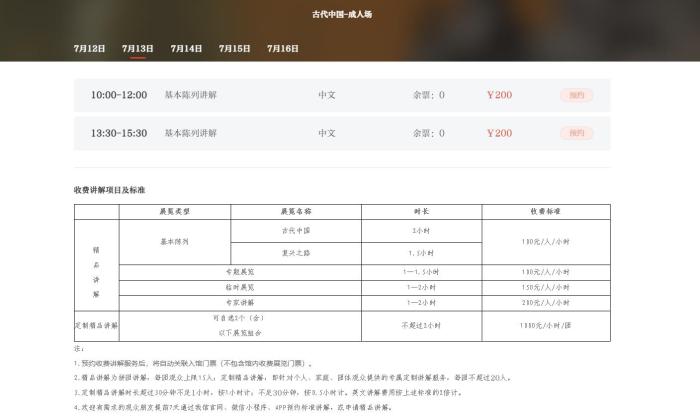 古代中国展收费讲解项目及标准 截图自国家博物馆官网