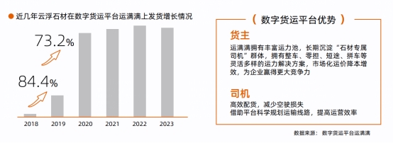 白皮书显示,近几年,云浮石材运输在公路货物运输方面,当地部分企业开始依托运满满、货车帮等数字货运平台找货车进行石材等产品运输。同时,当地专业物流公司逐渐缩减自有车辆占比,采取在运满满、货车帮等数字货运平台进行调车的方式来降低资产投入及管理成本,并不断提升自身专业性,为当地石材企业提供更优质的服务。