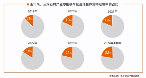 运满满数据显示,云浮石材产业零担拼车在当地运输结构中悄然发生变化。2019年,公路货物运输零担运输在整体货物运输中占比为13%;2020年增长至18%;2021年增长至19%;2022年略微回落至16%;2023年增长至21%;2024年一季度占比22%,总体保持增长态势。