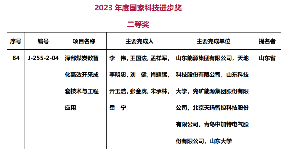 2024年6月24日,2023年度国家科学技术奖励大会在北京人民大会堂举行,共评选出250个项目。其中,由山东省提名,山东能源集团有限公司牵头,天地科技股份有限公司,山东科技大学,北京天玛智控科技股份有限公司,青岛中加特电气股份有限公司,山东大学,中煤张家口煤矿机械有限责任公司,北斗天地股份有限公司,煤炭科学技术研究院有限公司等10余家单位完成的“深部煤炭数智化高效开采成套技术与工程应用”项目获国家科学技术进步奖二等奖。