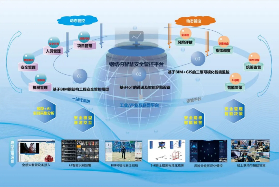 ——智能监测,保障安全。中国五冶建成钢结构全生命周期智慧管控中心,依托信息化、BIM和物联网等技术,实现从项目立项、深化设计、物资采购到生产制造、成品发运等全流程信息化管理,动态追踪项目节点进度及异常情况,降低浪费和管理成本,提升生产准交率。上海宝冶在装配式钢结构建筑中,应用智能监测技术,实时掌握建筑结构健康状况,为运维决策提供科学依据;建立支撑施工现场风险隐患智能识别、智能预警、智能决策的智慧安全管控系统,通过双重预防机制、安全措施可视化、智能安全帽AI分析预警,实现工程项目安全管理由被动监管转向主动管控,全面提升施工现场安全管控水平。