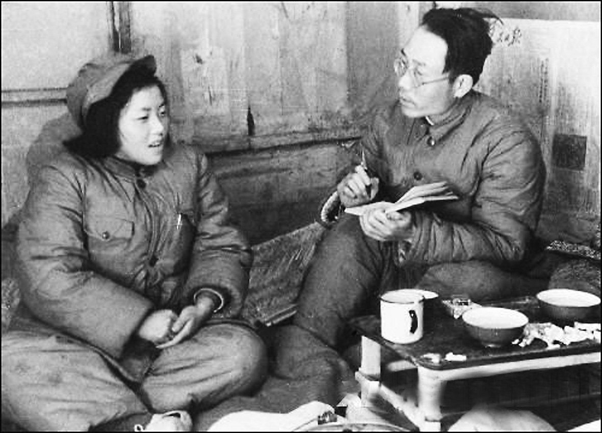 1952年,魏巍(右)在朝鲜三登野战医院采访志愿军模范护士罗克贤。