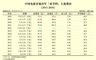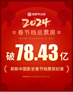 随着春节假期的结束,春节档电影的票房成绩也新鲜出炉。据猫眼专业版数据,截至2月17日,2024年春节档(2月10日-2月17日)总票房突破78.43亿,超2021年春节档78.42亿票房成绩,刷新中国影史春节档票房纪录。