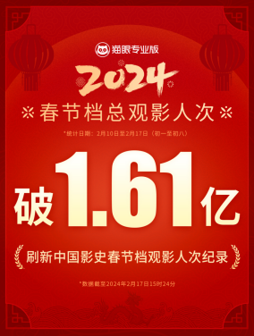 2024春节档不仅实现了票房突破,也刷新了观影人次。据猫眼专业版数据,截至2月17日,2024年春节档(2月10日-2月17日)总观影人次突破1.61亿,超2021年春节档1.60亿观影人次成绩,刷新中国影史春节档观影人次纪录。(陈岩)