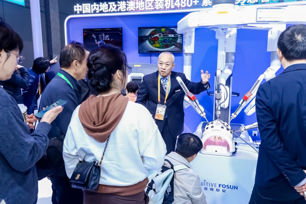 手术机器人是各家跨国医疗行业企业展示数智创新、产业协作的重头戏。作为每年医疗展区的“明星展品”,八赴进博的达芬奇手术机器人今年首次集齐“全家福”。