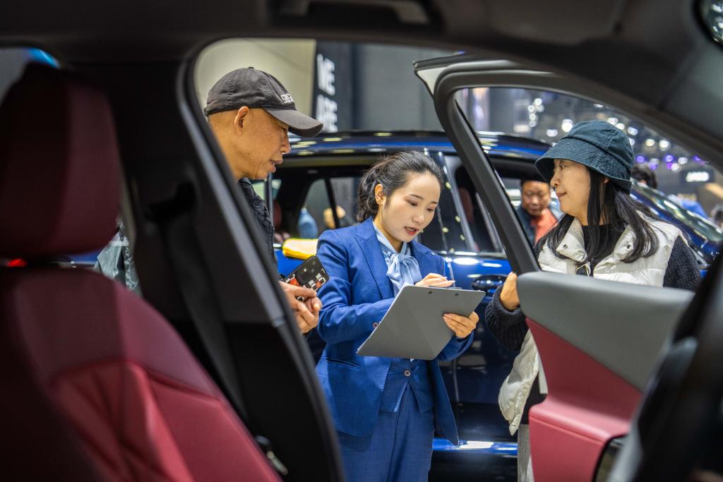 12月10日,工作人员(中)在介绍参展车辆。