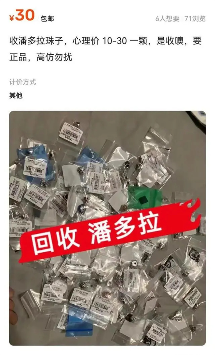 记者在二手交易平台闲鱼搜索“潘多拉手链”发现,仅有几位用户发布了回收潘多拉手链及串珠的笔记,回收价最低的在10-30元一颗。而这些珠子售卖的价格为四五百元左右。还有不少用户在平台上出售自己闲置的潘多拉手链,带珠子的整条手链出售价在150-500元不等。“当时2000元买的潘多拉手链现在某二手交易平台上399包邮都卖不掉。”一位消费者表示。