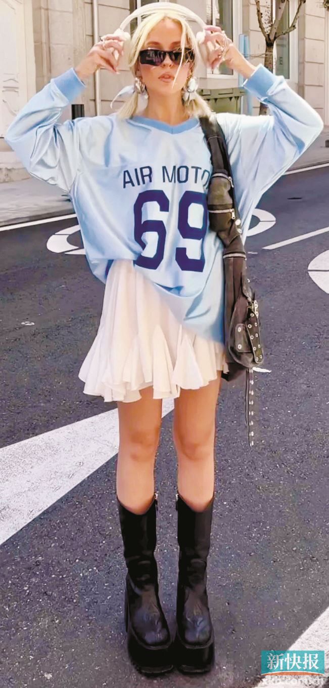 正常版型的球衣采用“下半身消失”搭配法,同样能穿出好身材,对腿型有信心的时髦精可搭一双中筒袜,时髦值飙升。
