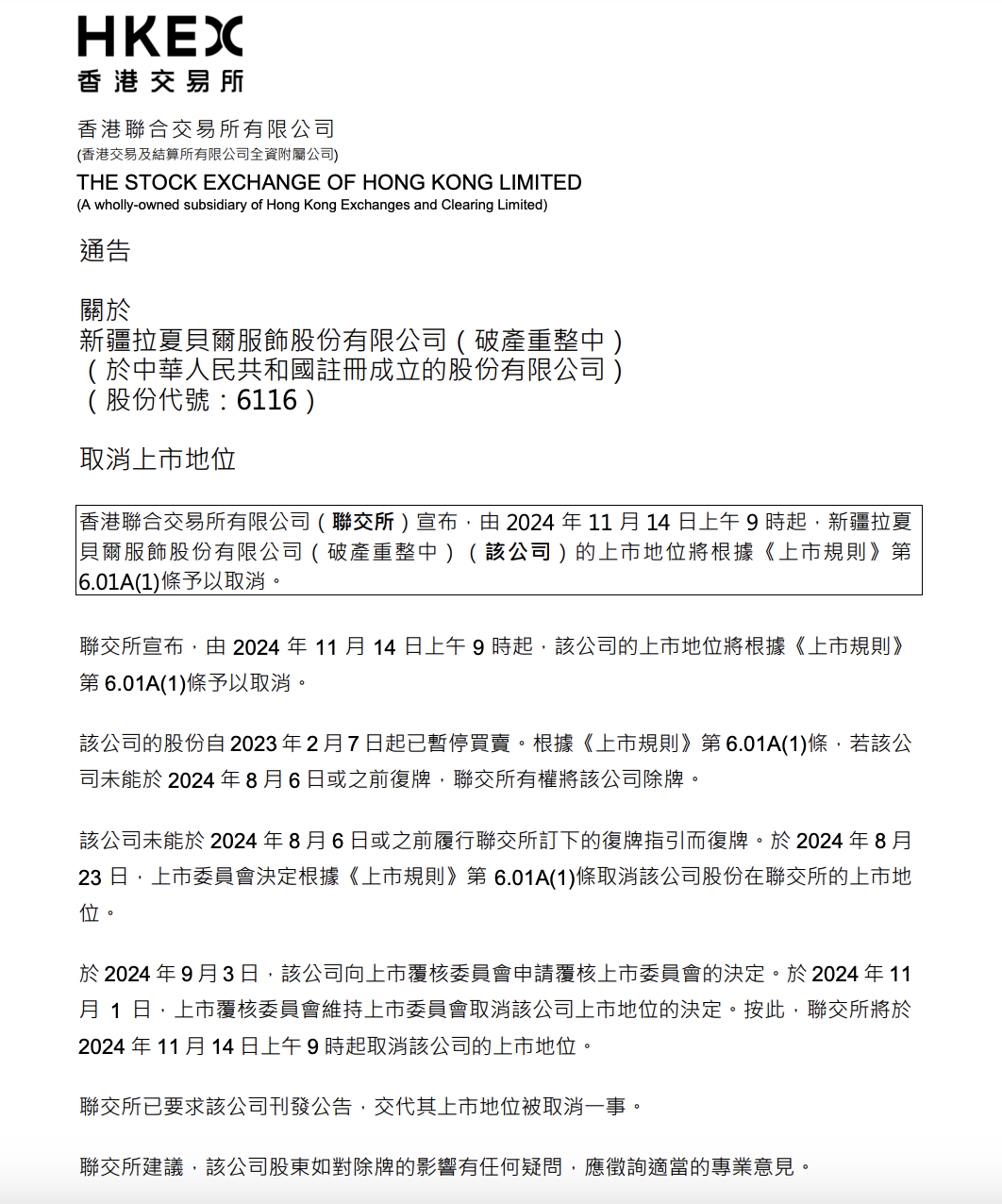 香港联合交易所(以下简称香港联交所)公告显示,由2024年11月14日上午9时起,新疆拉夏贝尔服饰股份有限公司的上市地位将根据《上市规则》第6.01A(1)条予以取消。除此之外,11月13日,拉夏贝尔发布公告称,公司秘书及授权代表黄慧玲已提出辞职。