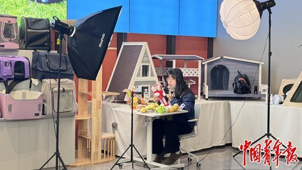 1月9日,一名主播正在平阳宠物小镇直播基地直播。中青报·中青网见习记者 赵丽梅/摄