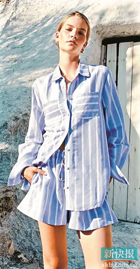 另一充满“航海味”且又比较“日常”的单品则属条纹衬衫,宽松版型更符合这一风格的调性,无论是搭配高腰短裤还是伞裙,配一双麻底帆布鞋,都能一秒拥有海边假期的氛围感。搭配同样宽松廓形的蓝色休闲西装则显得刚柔并济,松弛而不松散。