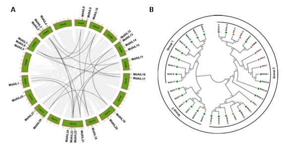 A: MdAIL基因的染色体定位和共线性分析;B: 苹果和拟南芥AILs的系统发育关系。