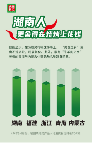 在为烧烤花钱这件事上,“美食之乡”湖南不遑多让,稳居首位。此外,素有“牛羊肉之乡”美誉的青海与内蒙古也毫无悬念地跻身前五。