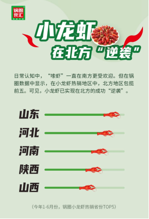 比如,日常认知中,“嗦虾”一直在南方更受欢迎。但《报告》显示,在小龙虾热销地区中,北方地区包揽前五。可见,小龙虾已实现在北方的成功“逆袭”。