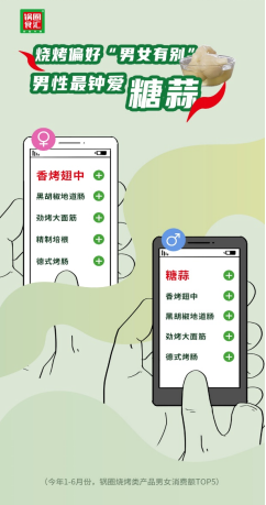 而在烧烤产品的偏好上,也呈现出“男女有别”的现象。《报告》显示,在最喜爱的烧烤产品中,女性消费者首选香烤翅中,男性的首选则是糖蒜,榜首之外则两者无甚差异。