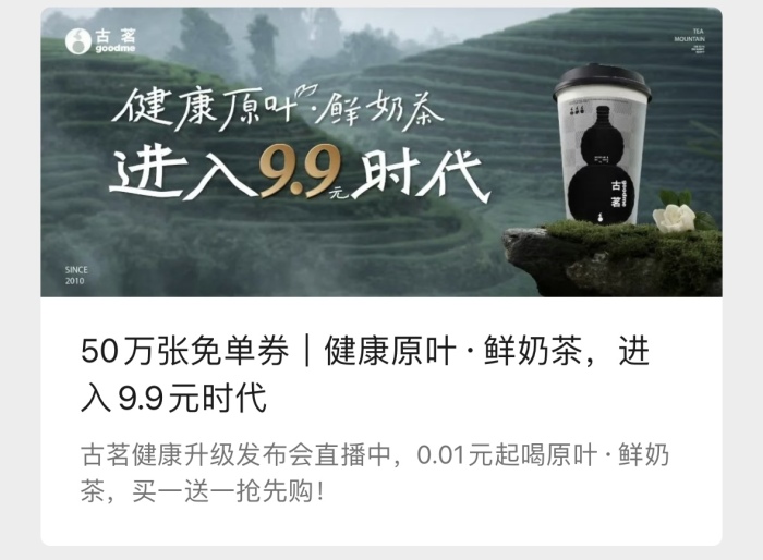 7月12日,古茗推出活动宣布其原叶鲜奶茶进入9.9元时代,对旗下7款鲜奶茶产品开展一个月的促销活动。活动规则页面显示,通过邀请好友的方式可以获得9.9元、6.9元等畅饮券,最低价的一张券定价0.9元。
