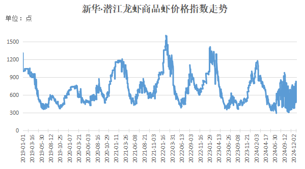 临近元旦,下游消费提振,带动小龙虾需求增加,叠加大虾和炮头虾供应偏紧,支撑小龙虾市场交易价格持续上涨,本期价格指数同比增幅扩大。新华指数监测数据显示,截至12月16日,新华·潜江龙虾商品虾价格指数报777.89点,环比上期(2024年12月9日,下同)上涨35.85点,涨幅4.83%;较基期(2019年1月1日,下同)下跌222.11点,跌幅22.21%。