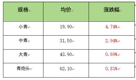截至12月23日,青虾均价报39.35元/斤,环比上涨1.68%。其中,小青均价报19.90元/斤,环比上涨4.74%;中青均价报31.50元/斤,环比上涨2.94%;大青均价报43.90元/斤,环比上涨0.69%;青炮头均价报62.10元/斤,环比上涨0.81%。