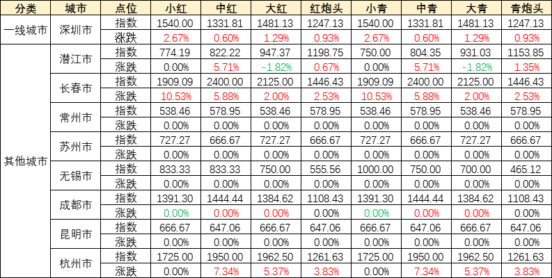 从主要销区来看,深圳小龙虾价格指数小幅上涨,小虾和大虾涨幅较大;潜江不同规格虾价格指数涨跌互现,中虾涨幅较大,大虾小幅下跌;长春小龙虾价格指数小幅上涨,小虾和中虾涨幅较大;杭州小龙虾价格指数稳中有升,中虾和大虾涨幅较大;其余城市各规格品价格保持稳定。