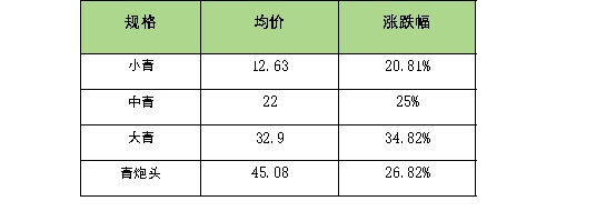 截至5月5日,青虾均价报28.15元/斤,环比上涨27.96%。其中,小青均价报12.63元/斤,环比上涨20.81%;中青均价报22元/斤,环比上涨25%;大青均价报32.9元/斤,环比上涨34.82%;青炮头均价报45.08元/斤,环比上涨26.82%。