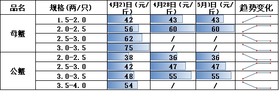 本期大闸蟹价格保持平稳。具体而言,截至2025年5月1日,1.5-2.0规格母蟹价格报43元/斤,环比持平;2.0-2.5母蟹价格报60元/斤,环比持平。公蟹方面,2.5-3.0规格公蟹价格报47元/斤,环比持平;3.0-3.5规格公蟹价格报55元/斤,环比持平。(李伯罧、李颖)
