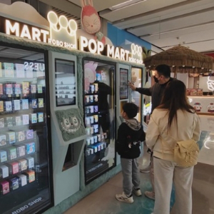 2025年1月,泰国游客在上海世茂广场的一个泡泡玛特自助售货机前选购盲盒。新华社记者张梦洁 摄