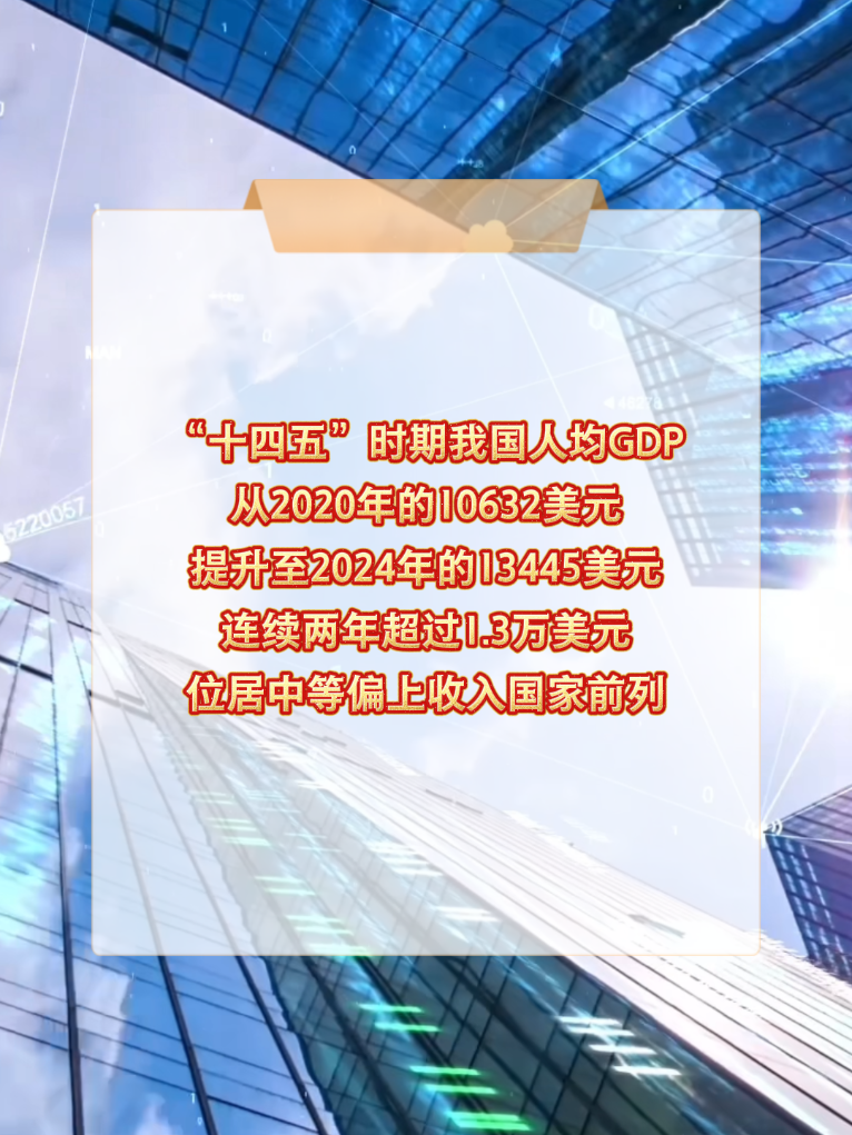 人均国内生产总值(GDP)是衡量一个国家或地区经济发展水平和富裕程度的重要指标。“十四五”时期,我国人均GDP从2020年的10632美元提升至2024年的13445美元,连续两年超过1.3万美元,位居中等偏上收入国家前列。