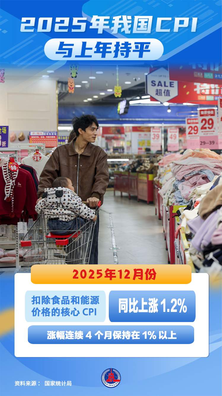 新华社北京1月9日电(记者王雨萧)国家统计局1月9日发布数据显示,2025年12月份,全国居民消费价格指数(CPI)环比上涨0.2%,同比上涨0.8%;2025年全年,CPI与上年持平。