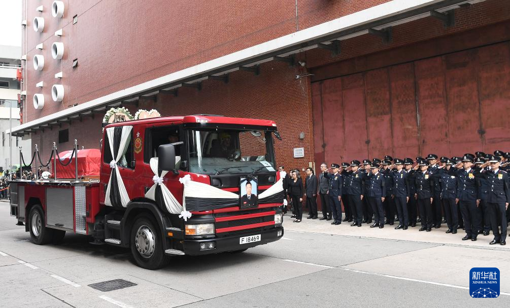 12月19日,由消防车改装的灵车离开位于香港九龙红磡的世界殡仪馆。新华社记者 陈铎 摄