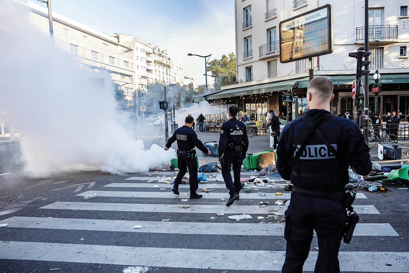 9月10日,在法国巴黎街头,警察阻止示威者用垃圾桶封锁街道