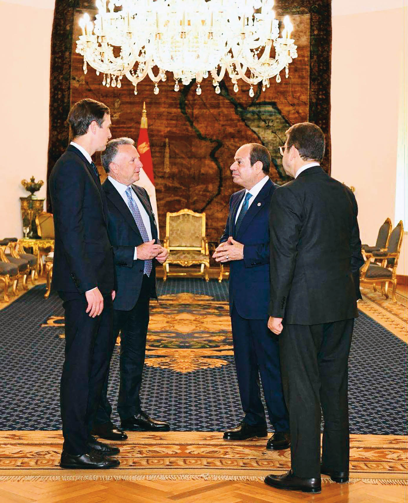 10月9日,埃及总统塞西(右二)在开罗会见美国中东问题特使威特科夫(左二)和特朗普的女婿库什纳(左一)